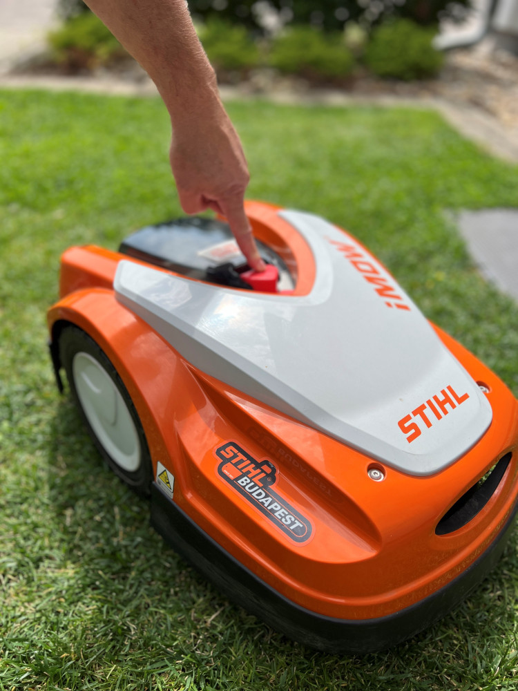 Vegyük ki a robotfűnyírót a dokkból, és a STOP gomb megnyomásával biztosítsuk hogy nem fog elindulni.
